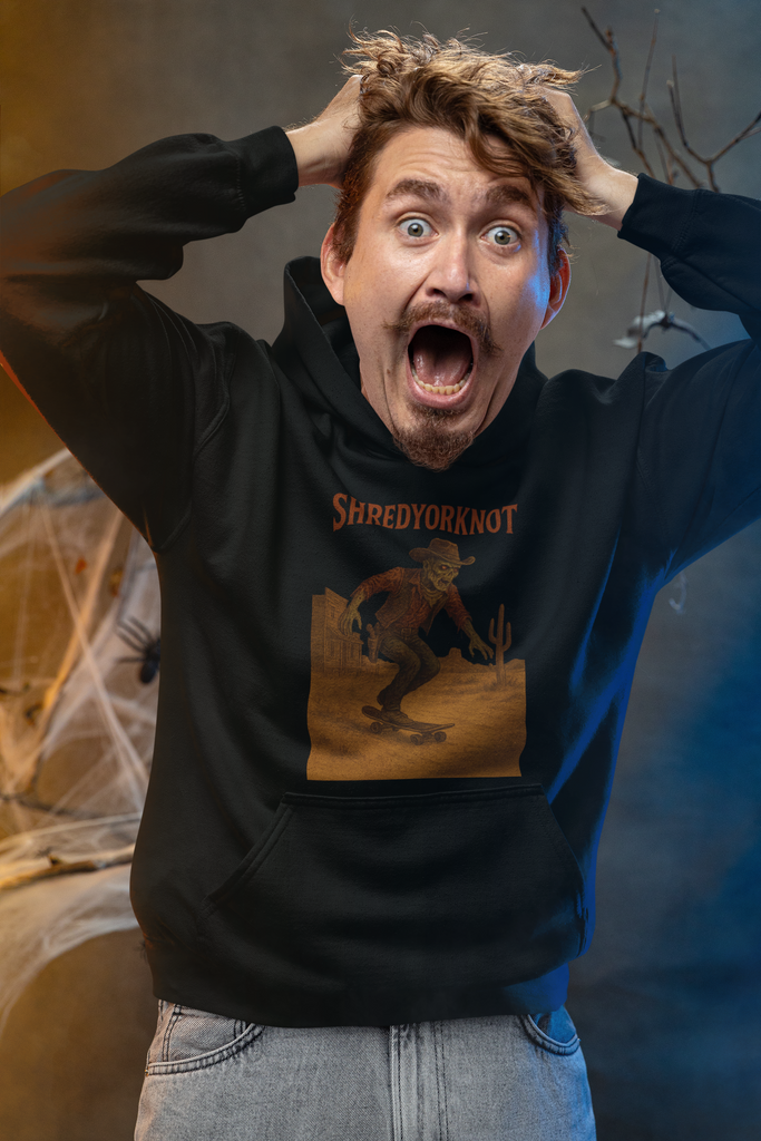 Ride into the undead Wild West with our High Noon Zombie Cowboy graphic tee and hoodie. This design brings bone-chilling grit to desert streets, featuring a reanimated gunslinger shredding across the dusty frontier on his skateboard. With glowing eyes, a tattered cowboy hat, and a revolver at his side, this outlaw is here to prove that legends never die, they just skate harder.